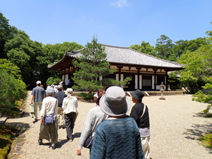 バス内で事前にガイドさんから法隆寺にまつわるミニ知識を学習していたおかげで、法隆寺境内内の建物や仏像について確認しながら見学することができました。法隆寺境内から夢殿まで行き、バスに帰るまで約一時間半の道のりでした。炎天下の中、御高齢の方もおられましたが、ガイドさんの水分補給の指示と、できるだけ日陰を歩くように配慮していただいたおかげで、全員無事に見学をすることができました。
