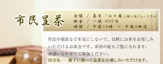 ■秋の市民茶会(桜ヶ丘ミュージアム) 日程:11月9日(日) 流派:宗偏吉田流、煎茶 薫風流 ■春の市民茶会 (桜ヶ丘ミュージアム) 日程:令和8年3月22日(日) 流派:裏千家、煎茶 売茶流 秋・春ともに料金は2席1,300円、当日1席750円 ※宗偏吉田流の偏は正しくはぎょうにんべんです